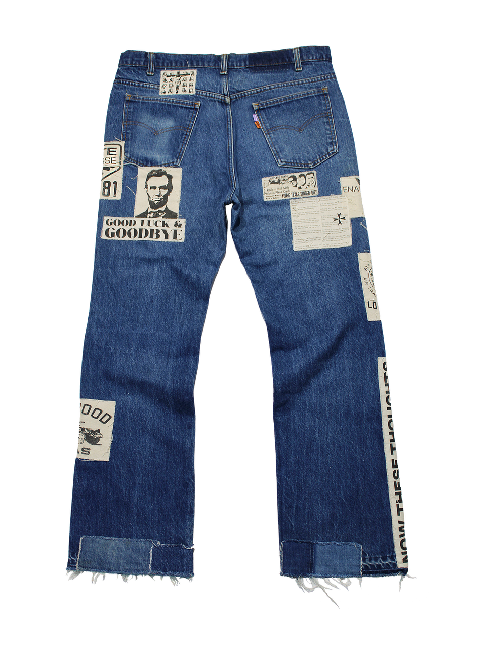 These authentic 1970s Levi's jeans have been lightly hand-distressed, showcasing heel patchwork with various vintage denim. This unique pair of denim is embellished with an array of one-of-a-kind cotton patches that weave a playful narrative of American history, adding character and charm to the style.